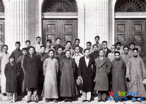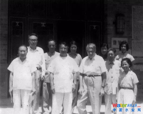 圖:50年代末葉企孫(一排左一)與李約瑟先生在北大地學(xué)樓前合影